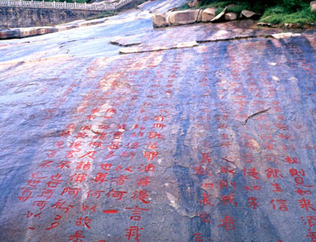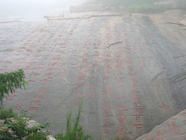 經石峪金剛經刻位于斗母宮東北經石峪,是中國現存規模最大的佛經摩崖刻石。 經文刻于面積2064平方米的緩坡石坪上,自東而西刻《金剛般若波羅密經》,采用后秦鳩摩羅什譯本,原本全1卷、32分目、5172字,經刻只刻到15分目“特經功德 兮”,計44行,每行125字或10字不等,凡2799字,字徑50厘米。經刻歷千余年風 雨剝蝕、山洪沖擊、游人踐踏、捶拓無度,已殘泐磨滅過半,現僅存經文41行、 1069字(包括可認讀的殘字和雙勾字)。