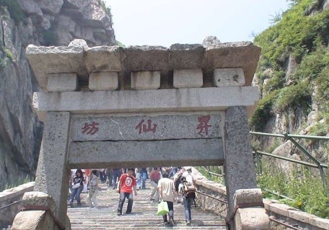 升仙坊位于山東省泰山中路緊十八盤的起始處,為兩柱單門式石坊,額題楷書“升仙坊”。此處山勢陡峻,懸崖峭壁,上臨岱頂天庭,咫尺仙境,似有飄然升仙的意境,故名“升仙坊”。游人至此小憩,每每浮想聯翩?;匾暽较?,常有騰身云霄之感,舉首仰望,南天門近在眼前,奮力攀登,岱頂在望。 升仙坊位于南天門下。全石雙柱單門式,寬2.82米,通高4.5米,建于雙層方 石基上。基石長1.82米,寬0.64米,高0.5米。柱方形,下施滾墩石,獸頭石鼓狀。