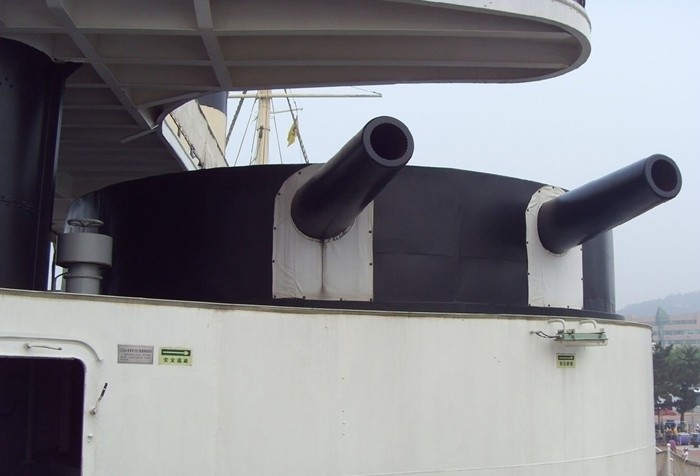 “除4門威震亞洲的305毫米口徑主炮外,“定遠”級軍艦首尾各有1門150毫米克虜伯1880式鋼箍套炮。實際口徑149.1毫米,身管為35倍徑,長5220毫米,來復線長4800毫米,炮管重4.77噸,炮架重5.16噸,可用彈藥包括開花彈與實心彈,均重51千克,最大的發射藥包重17千克。版權所有山東聊城聊之旅國際旅行社有限公司,轉載必究!火炮初速580米/秒,有效射程11000米。這2門火炮分裝于首尾的2個炮罩內,由人力轉動。