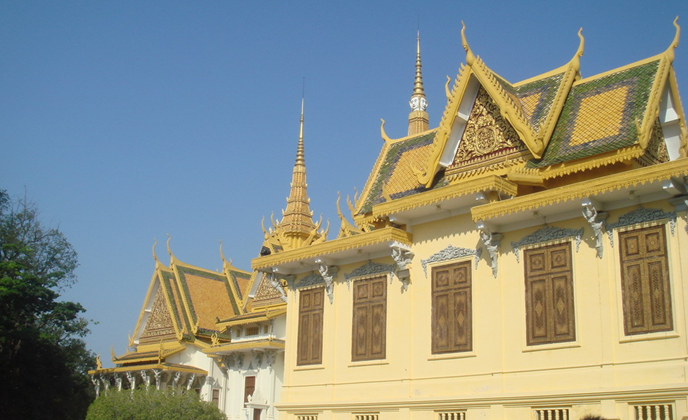 金邊皇宮(Royal Palace),也稱四臂灣大皇宮,建造于1866-1870年 。坐落于金邊東面,面對湄公河、洞里薩河、巴沙河交匯而形成的四臂灣,屬于典型的高棉式建筑。王宮為長方形,長435米,寬402米,外有城墻,里面共有20余座建筑物。建筑極富高棉傳統風格和宗教色彩,多為黃、白兩色,黃色代表佛教,白色代表婆羅門教,所以看上去金燦燦的。