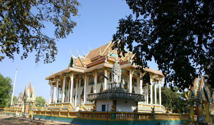 這座11世紀的寺廟在馬德望北面僅13公里處,廟前有一尊較新但引人注目的28米高的佛像;寺廟已經破敗,看上去像“樂高”(Lego)拼裝玩具一樣搖搖欲墜。前往這里的公路兩邊棕櫚樹掩映,路邊的運河兩側枝葉茂盛,村落處處,這條路本身就值得一游,尤其是在清晨或夕陽西下之時。
