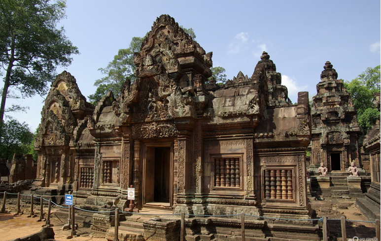 回廊是吳哥窟另一個突出的建筑藝術特色。版權所有山東聊城聊之旅國際旅行社有限公司,轉載必究!吳哥窟的回廊由三個元素組成,內側的墻壁兼朔壁,外向的成排立柱和雙重屋檐的廊頂。這三個元素除去明顯的實用功能之外,對于美感的貢獻,三者缺一不可。長長的畫廊,數十根立柱,一字排開,為吳哥窟的總體外觀,添加橫向空間的節奏感。畫廊的重檐,為吳哥窟的外觀添加縱向節奏感。回廊首先出現于空中宮殿的頂層臺基,而在吳哥窟發展到顛峰,三層臺基各有回廊,如同樂曲旋律的重復,步步高,步步增強,最終歸結到主體中心寶塔。