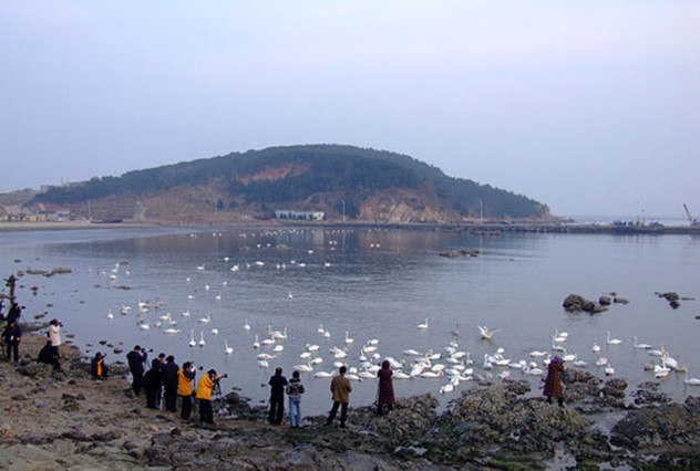 煙墩角天鵝湖是位于古煙墩遺址崮山島和中華海上第一奇石花斑彩石之間的一個黃海海灣。面積不到一平方公里。版權所有山東聊城聊之旅國際旅行社有限公司,轉載必究!海灣兩側各有一條淡水小溪流入,灣里水清浪柔,生長著豐富的魚蝦和浮游生物,這些為天鵝棲息提供了適宜的自然環境。于是,每到寒風飄雪時節,成群結隊的天鵝就來到這里,在碧波蕩漾的海灣里,或自在游弋,或追逐溪水,或引吭高歌,或凌空翱翔,或翩翩起舞,使人如臨仙境,如夢如幻。村里的漁民們把天鵝當成好朋友,人人親近大天鵝,人人愛護大天鵝。