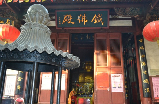 鐵佛殿內(nèi)有鐵佛一尊,稱(chēng)“阿彌陀佛”,疊掌跏趺坐于蓮花臺(tái)上,外披泥貼,法相莊嚴(yán)。鐵佛高5.3公尺,頭部實(shí)心,身軀空心,人立其肩上,伸手摸不到頭頂,估計(jì)重量達(dá)十萬(wàn)斤以上。清乾隆時(shí)陳云程《閩中摭聞》載,鐵佛殿前柱子兩側(cè)刻有明末舉人曾異所撰楹聯(lián):“古佛由來(lái)皆鐵漢,凡夫但說(shuō)是金身。”