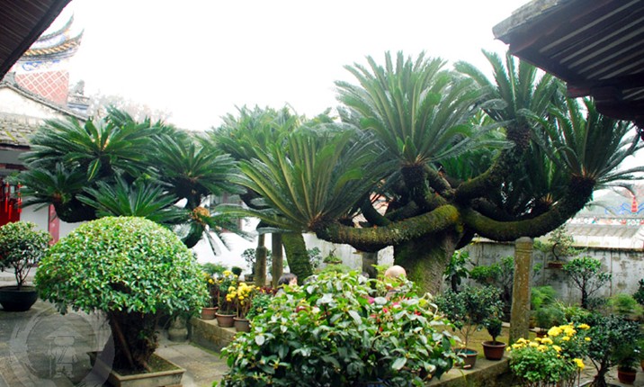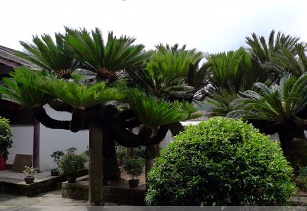 在方丈室的庭院內種有三析鐵樹,相傳有兩株樹齡已超過一千年,其中一株為閩王王審知所種,一株是開山祖神宴法蚰所植。版權所有山東聊城聊之旅國際旅行社有限公司,轉載必究!1929年虛云老和尚應當時福建省主席楊幼京之請,回鼓山涌泉寺任住持,講經傳戒、整頓寺規、創辦戒律學院,恢復禪堂規制,修建頹廢殿宇,整頓經版文物,勛勞卓著。1930年,他為僧眾講《梵網經》,恰逢兩株千年的鳳尾鐵樹開花,遠近來觀乾,絡繹于道。當時,聘任羯摩師文質和尚撰小文記之:“庚午春(1930)值虛云兄主持石鼓,傳授戒法,余以隨喜之余,航海赴閩,參予盛典。既至。則鐵樹開花,繁茂無比,花大如盆,須瓣若鳳尾,咸以優曇相慶。詢之耆日,皆言叟物也,其一為閩王手植,一為圣國師手植,迄今千載,敷此妙華,實為希有。邀虛兄攝影留證,用志涌泉寺瑞應焉。”是年虛云和尚已九十一歲了,方丈室鐵樹三株,兩雌一雄,雄花似小狐尾,雌花如黃絨球,真是奇觀,近期年年開花,游人可飽眼福。