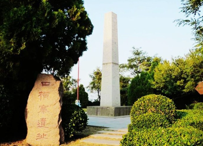 這里是田橫寨遺址,為長方形,東西長120米,南北寬80米。南側的“田橫寨遺址”石碑為書法家大康題寫。這座田橫紀念柱高7米,采用花崗巖雕鑿而成。四面浮雕分別表現了“聚事”、“演練”、“進攻”、“建國”四個場面。西側是一座田橫雕像。他面北而立,氣宇軒昂,象似在高呼“吾豈能北面而事臣?”雄姿凜然,氣壯山河。