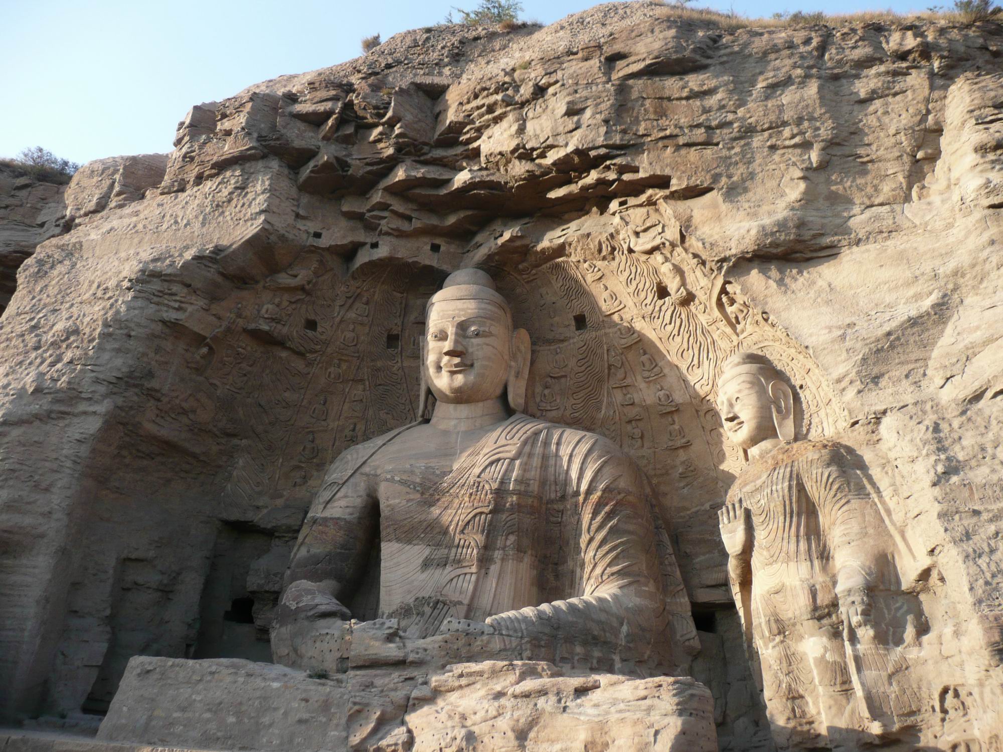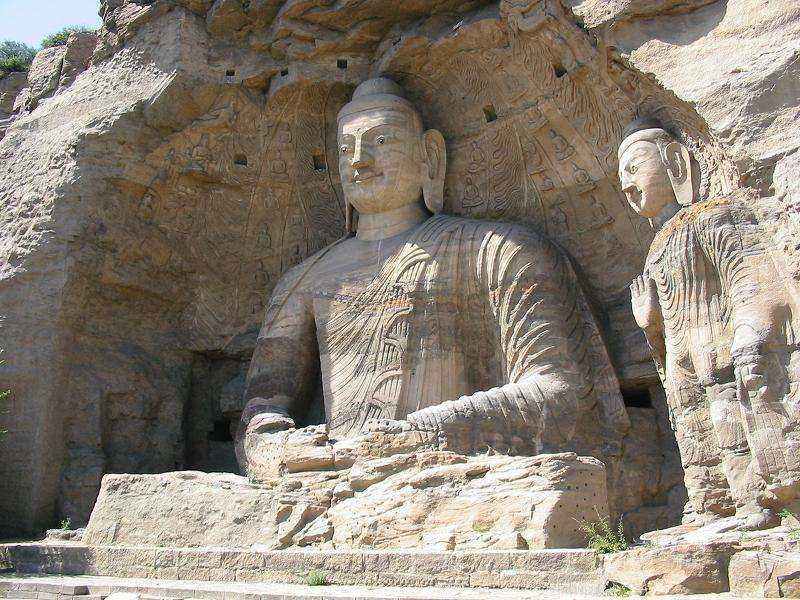 第二十窟,窟前帶大約在遼代以前已崩塌,造像完全露天。立像是三大佛,正中的釋迦坐像,高13.7米,這尊佛像面部豐滿,兩肩寬厚,造型雄偉,氣魄渾厚,為云岡石窟雕刻藝術的代表作。