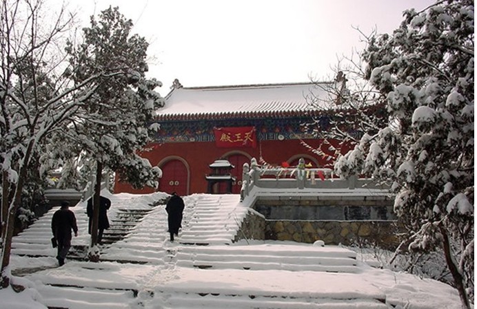 沿長廊拾級而上,兩側是閩王祠、伽藍殿,正中為大雄寶殿。大雄寶殿初建于五代開平二年(908年),宋朝重修。明朝毀于火災,現存為清光緒八年(1882年)重建的建筑。殿中供奉三世佛像,兩側為十八羅漢像。供桌前有一鼎銅鑄大香爐,兩旁各立一尊銅童子像。大殿后側有清康熙年間鐵鑄“三圣像”,表面貼金,重約2300斤,金光燦燦。大殿天花板上是清光緒八年(1882年)繪制的各式圖案242塊,有禪龍圖129塊,版權所有山東聊城聊之旅國際旅行社有限公司,轉載必究!丹頂鶴86塊,大象、麒麟、白馬、猴等圖案27塊,色彩鮮艷,與羊色燈相輝映,使殿內金碧輝煌,莊嚴肅穆。大雄寶殿后為法堂。東側下方為藏經樓。