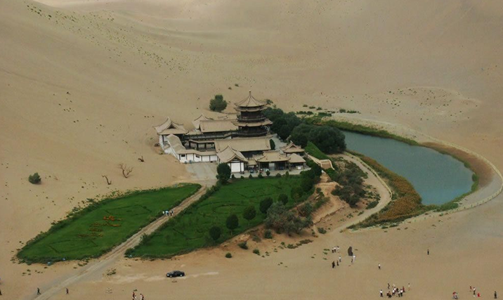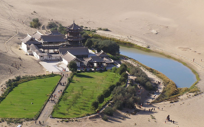 月牙泉位于敦煌市西南5公里處,是一處神奇的漫漫沙漠中的湖水奇觀。鳴沙山下,泉水形成一湖,在沙丘環抱之中,酷似一彎新月而得名月牙泉。月牙泉,古稱沙井,俗名藥泉,泉邊蘆葦叢生,水中魚兒自在,胡楊沙棗綠樹成蔭,羅布麻、枸杞等藥用植物豐茂,亭臺樓榭古香古色,春夏季節百花盛開,夏秋季節梨果飄香。自漢朝起即為“敦煌八景”之一,得名“月泉曉徹”。月牙泉南北長近100米,東西寬約25米,泉水東深西淺,最深處約5米,彎曲如新月,因而得名。一灣清泉,漣漪縈回,碧如翡翠。