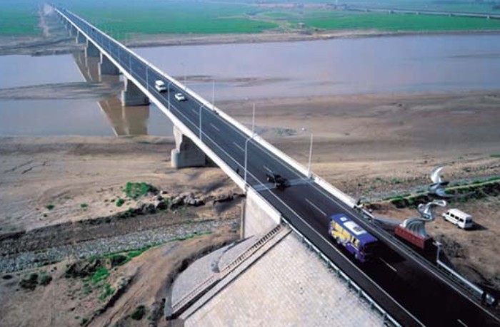 位于市南郊,它是從包頭市白云鄂博到陜西等省通衢的重要組成部分。大橋全長(zhǎng)810米,主孔12孔,每孔跨徑為65米,橋面寬12米,下部由14墩臺(tái)組成,上部構(gòu)造為預(yù)應(yīng)力鋼筋混凝土箱式連續(xù)梁,采用最新工藝多點(diǎn)頂推法施工。上部結(jié)構(gòu)為3聯(lián)4孔65米預(yù)應(yīng)力鋼筋混凝土連續(xù)箱梁,跨徑組合為3*(4*65)+20米,1983年建成通車(chē),是黃河中上游最大的橋梁之一。設(shè)計(jì)荷載汽車(chē)—20級(jí);拖車(chē)—100級(jí)。