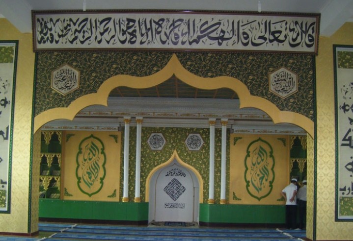 遠遠望去,清真寺的塔樓和月牙標(biāo)志十分醒目。四周院墻和古式殿宇高高矗立。這座寺院離路邊不遠,卻高出路面十多米,所以必須沿著一條向北延深的小巷向高處走百十多米,方可到達山門口。這里,環(huán)境清靜,境界安謐。進入山門后,便可見院內(nèi)矗立著牌匾。再往里走,就可見到清真寺大殿。