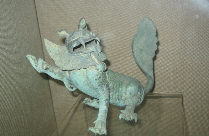 青銅大鐃 西周。高76.8厘米、甬長(zhǎng)29.8厘米,重100.35千克。20世紀(jì)70年代出土。大鐃為雙范合鑄,兩面各有18個(gè)乳突狀枚。器體布滿(mǎn)以云雷紋為主的紋飾,甬的上半部?jī)擅娓黠椨蝎F目一對(duì),與云雷紋組成變體獸面紋。旋帶以細(xì)云雷紋為地,飾突出的勾連C形紋。舞面飾對(duì)稱(chēng)的粗云雷紋四組。鐘面飾粗大深刻的云雷紋,只鼓部中央的隧部略高起,上飾淺細(xì)的圖案化獸面紋。該鐃形體之巨大,紋飾之精美,在國(guó)內(nèi)都屬罕見(jiàn)。