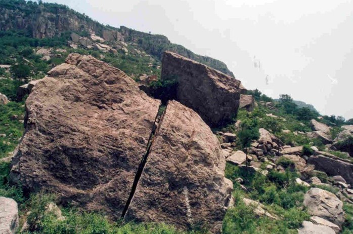 據地質專家初步考證認為:這種崩塌現象是300年前發生的郯城大地震引發了此處的大山崩而造成的。站在巨石之上,閉目凝神,300年前那山崩地裂的轟鳴聲仿佛仍然在耳畔回響。傳說山腳下曾有一個小村莊在一夜之間被巨石淹沒,除了一位外出遛鄉的貨郎和一只躲在地窖里的貓幸免于難外,其他生靈全部葬身石下。