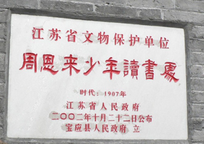 周恩來少年讀書處位于江蘇省寶應(yīng)縣城縣南街水巷口3號(hào),原為周恩來同志的外祖父陳沅的宅第,整個(gè)建筑為清代風(fēng)格,分東西兩個(gè)院落,共十八間房屋,建筑面積500平方米,占地面積700多平方米。1996年寶應(yīng)縣政府組織全面修繕,恢復(fù)原貌,1998年3月5日周恩來同志誕辰100周年正式對(duì)外開放。