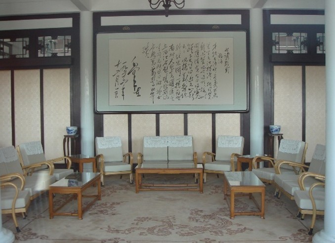 前客廳一共有五間房屋。靠東靠西的各一間用布簾與中間相隔,使中間三間室內顯得靜謐祥和。周恩來接見外賓、會見客人等均在這中間三間房里舉行,周恩來一般坐在東邊主席位置上,西邊是主要客人的客席座位,會見時如用翻譯,就在后邊加上兩把椅子和一只小茶幾就行了。兩側是主要陪同人員坐位,如果隨行陪同人員太多,也可以臨時多放幾把椅子。周恩來在建國初期曾在這里會見原蘇聯駐中國大使羅申,原印尼總統蘇加諾等人。一般東側布簾內的那間房子里放置有茶水、茶具。版權所有山東聊城聊之旅國際旅行社有限公司,轉載必究!這樣好方便工作人員隨時送上;西側布簾內的那一間放置有小圓桌兩張。周恩來有時會見國內外的知心客人或朋友時,談到吃飯時間了,為了節省時間,也會讓工作人員在后邊簡易鍋灶上燒幾個菜招待客人,邊吃邊談,吃完飯繼續談。象越南的胡志明主席、柬埔寨的西哈努克親王、國內的廖承志同志等都在大廳里和周恩來一起用過餐。