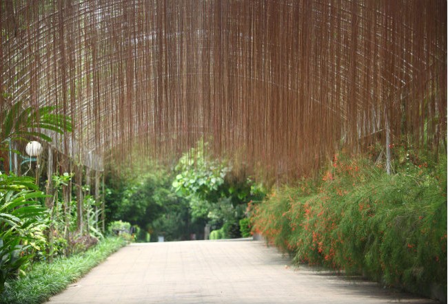 香草蘭試驗示范基地是植物園里的第二個展區(qū)。香草蘭是一種名貴的熱帶香料植物, 素有“食品香料之王”的美譽。香草蘭是藤本植物,它們生長在科研人員搭好的架子上,構(gòu)成了一片綠蔭,架子下涼快通風,可見香草蘭跟人一樣,也喜歡涼快。