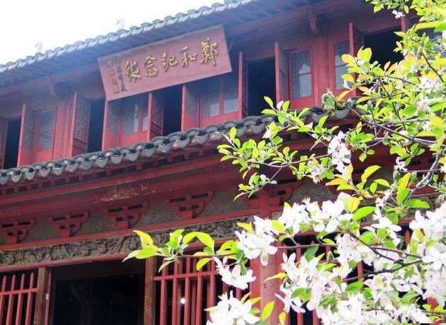 大門之內(nèi)立有“鄭和故里”牌坊,其后,參天樹叢中掩映著鄭和紀(jì)念館,陳列有鄭和下西洋的碑文拓片、石刻以及航海用具等文物。