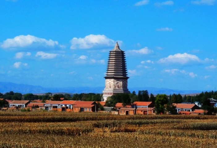 這座八角十三級密檐式磚塔,高80.22米,塔基底徑48.6米,塔體直徑34米,在現(xiàn)存遼塔中雄居魁首。據(jù)元一統(tǒng)志載可能建于遼重熙四年(公元1036年)。塔身赤面有兩行蒙文,內(nèi)容是:“大清咸豐甲寅年敬修”,為清代補(bǔ)修所寫。