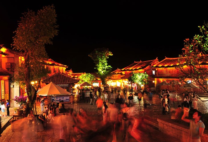 四方街最迷人的是晚上,版權所有山東聊城聊之旅國際旅行社有限公司,轉載必究!沿河都是些大大小小的酒吧,茶樓。其中不乏外國人經營者。這些酒吧,茶樓門前,大紅燈籠型狀各異,高高的懸掛在每戶人家門前。晚間的四方街就這樣籠罩在溫暖祥和的氣氛中。紅燈籠的倒影隨河水飄蕩,約約綽綽。這里是歷代集市中心,每日萬頭躦動,熱鬧非常。從四方街四角延伸出四大主街,直通東南西北四郊,又從主街岔出眾多街巷,如蛛網交錯,往來暢通。街道全用五彩石鋪砌,平坦?jié)崈簦绮粨P塵,雨不積水。幾乎每條街道一側都伴有潺潺流水。由此形成以四方街為中心,四周店鋪客棧環(huán)繞,沿街逐層外延的稠密而又開放的格局,古老的集市就這樣孕育了城市最初的形狀,這與中國傳統(tǒng)的四四方方的井字形街道是不是一樣的。