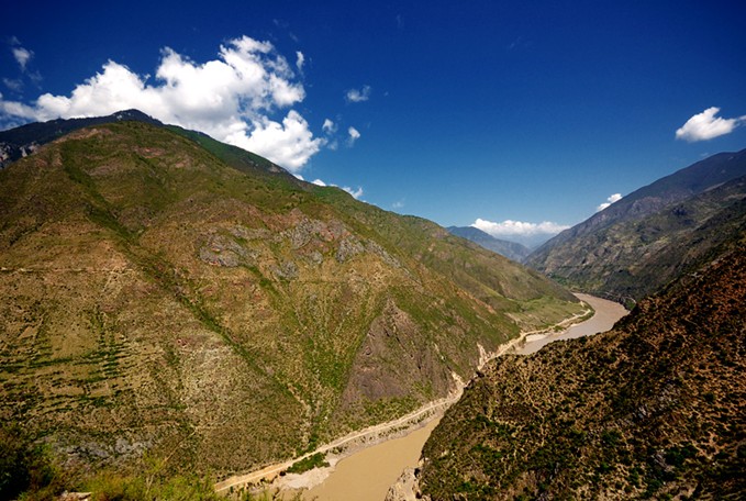 金沙江由北東去,匯集雅壟江、大渡河、嘉陵江,于是中國便有了長江。瀾滄江由北南下緩緩而流,穿越國界便成了鄰國湄公河的上游。怒江山北南下奔騰急湍闖進緬甸便成了薩爾溫江的上游。三江同發源于青藏高原,三江攜手并肩在云南崇山峻嶺中奔流。而金沙江經石鼓鎮天造奇觀(長江第一灣)急轉回頭大江東去最終流入太平洋……而瀾滄江、怒江穿流緬甸、越南、老撾、泰國最終流入印度洋……