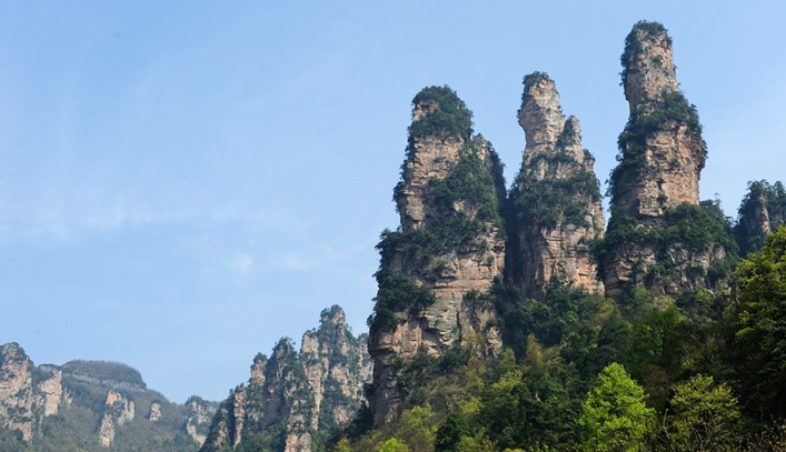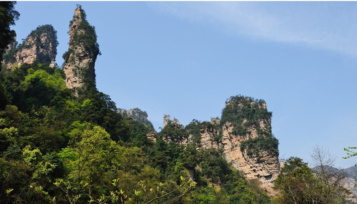 十里畫廊山清水秀,繁花似錦,百鳥爭鳴。境內景物造型奇特:若人,若神,若仙,似林,似禽,似獸的石英砂巖峰林在云霧中時隱時現,變化萬千。早在明代就有人寫下“人游山峽里,宛如畫圖中”等佳句。大自然這位雕塑大師,以鬼斧神工之國,在十里畫廊塑造了稀世珍品,它是藝術的世界,童話的世界和神秘的世界,為中外游客叫絕。