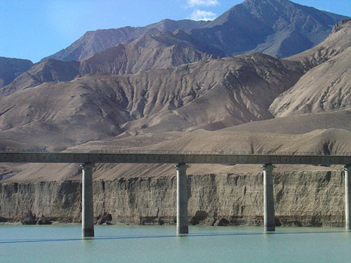 格爾木河上氣勢雄偉的格爾木水電站被稱為昆侖山下的明珠。格爾木河是柴達木盆地南緣的一條大河,昆侖山峰攝的冰雪夏日消融,它挾帶著營水奔騰咆哮。它的背后是一個碧波閃閃的人造水庫,庫容為四百多萬立方米;它的前面是一條飛架嶙峋峽谷兩岸的凌空鐵索天橋,水庫的水從大壩的三扇泄洪閘門噴涌而出,猶如霰雪,又似瀑布,玉珠四濺,水霧飛騰。