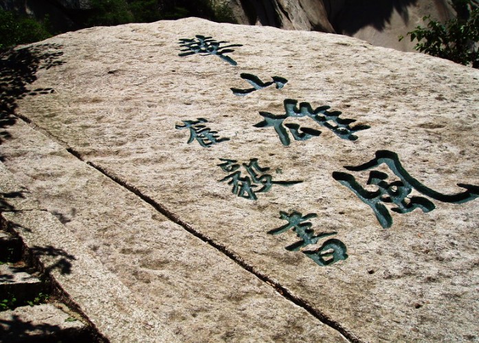 蒼龍嶺如一條橫臥在兩山之間的巨龍,在四周山色的映襯下,嶺下平臺酷似曲卷的龍尾,嶺盡處是懸石,如同回首怒吼的龍口。在龍口“云海”石刻下,肖四個圓,其中左側豎排的兩個只有圓周,而無圓心;但右側兩個既有圓周,又有圓心,為華山字謎之首,為“華山第一難題”。若細心悟之,象形文字中,圓表示“月”,圓中有點,表示“日”。據此石刻謎底為“二月二”日。俗有二月二龍抬頭之說,在龍口云海下刻此字謎,寓意希望蒼龍永遠行云布雨,真是恰如其分,匠心獨有,精紗絕倫。