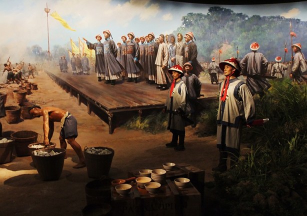 該館的陳列形式突破了傳統的陳列手法,注意把文物放在一定的環境氣氛中去展出,采取畫物結合,實物與輔助展品結合,采用場景、沙盤、聲光電模型、尋像放映等多種手段,使陳列形式生動、形象。如該館為了反映當年林則徐、關天培用木排鐵鏈封鎖虎門海口的情形,把征集來的木錨及一艘早期的劃船送上展廳,并復制了大木排鐵鏈,與長33米,高2.8 米的虎門海口形勢背景畫相結合,版權所有山東聊城聊之旅國際旅行社有限公司,轉載必究!構成了一幅氣勢磅礴,頗為壯觀的場景,形象地再現了當年用木排鐵鏈封鎖虎門海口的形勢,大大增強了展覽的效果。
