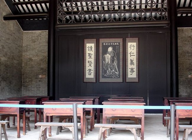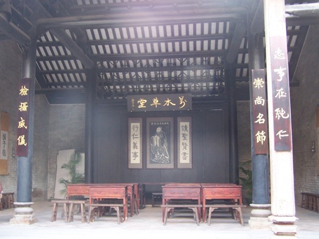 萬木草堂原為邱氏書室,建于清嘉慶九年(1804),為三間三進、兩天井、硬山頂的祠堂式建筑。碌灰筒瓦,兩邊保留有部分灰塑,青磚墻石腳,磚木結構,面闊三間15.8米,深三進35.3米,面積約為663平方米。