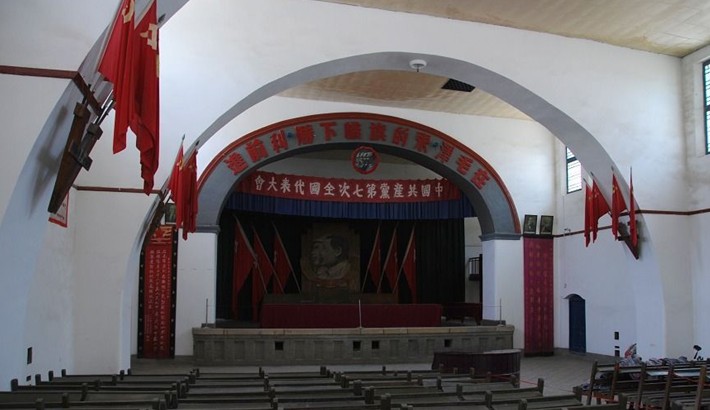 走進中央大禮堂,里面的陳設仍然保持著66年前的風貌。主席臺正中是毛澤東、朱德的巨幅畫像;會場后面墻上,懸掛著“同心同德”4個大字;兩側墻上懸掛4幅“堅持真理”、“修正錯誤”標語;靠墻邊插著24面紅旗,象征著中國共產黨24年奮斗的歷程;插紅旗的“V”字形木座是革命勝利的標志;版權所有山東聊城聊之旅國際旅行社有限公司,轉載必究!在主席臺的正上方,懸掛著一條引人注目的橫幅:“在毛澤東的旗幟下勝利前進!”