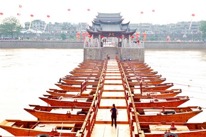 公元1171年 南宋乾道七年,知州曾汪,造舟為梁,舟八十有六只,以接江之東西岸,且峙石于中,以繩其勢,根其址,名曰“康濟橋”。