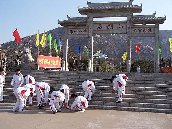 .試劍石 海州巨富糜竺,觀劉備有人主之相,傾囊相助,復興漢室。劉備與糜竺來到石棚山,劉備稱如能東山再起,定能劈開此石,他揮劍劈石,只見劍落石開。所以稱此石為劉備試劍石