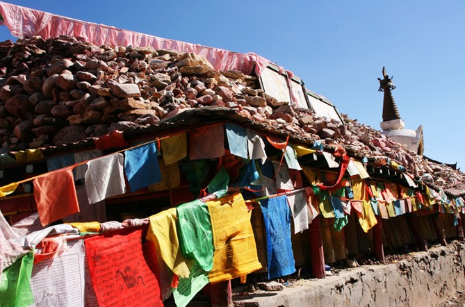 在青海省玉樹藏族自治州政府所在地結(jié)古鎮(zhèn),乘上3路公交車,大約20分鐘就到了新寨村,這里有世界上最大的瑪尼堆——新寨瑪尼城。新寨瑪尼城建于公元1715年,奠基人為第一世加納活佛宗求帕文,所以也稱為“加納瑪尼堆”。瑪尼堆在藏語中稱“多崩”,意為“十萬經(jīng)石”的意思。占地有兩個足球場大小的新寨瑪尼城,版權(quán)所有山東聊城聊之旅國際旅行社有限公司,轉(zhuǎn)載必究!南部是新寨寺,其他各個方向均用瑪尼石堆砌成墻,在高高的圍墻高處還布滿了隨風(fēng)飄舞的經(jīng)幡。