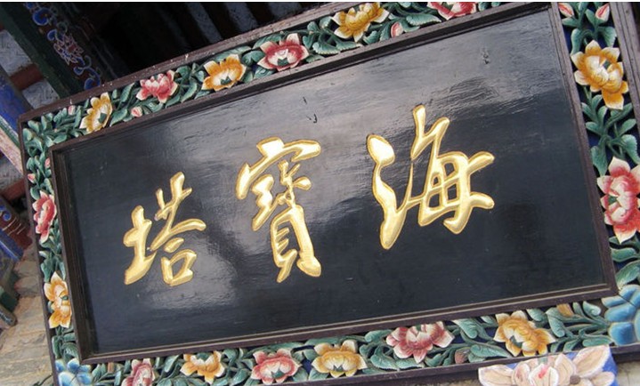高聳在大佛殿和韋馱殿之中的海寶塔,是寺內的主體建筑,又名“黑寶塔”,俗稱“北塔”。這是一座方形九層十一級樓閣式磚塔,通高 53.9米。塔建在一處方形寬闊的臺基地上,臺高5.7米,邊長19.7米。臺上四周有青磚砌花墻,東面正中有石階可以登臨塔座門。塔身平面呈方形,四壁出軒,每層四面設券門,均向外略有突出,構成鮮明的十二角形。塔身內為上下相通的方形空間,各層之間以木板相隔,沿木梯可登至頂層。塔身四面轉角處均懸有風鈴,風吹鈴響,更覺寧靜悠揚。塔上端為磚砌四角攢尖頂,頂上置方體桃形綠色琉璃塔剎。海寶塔建筑風格獨特,方形的塔身,四面的券門,眾多的棱角,四角的尖頂,為中國古塔所罕見,被視為中國古代建筑的杰作。