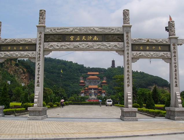 南沙天后宮,緊臨珠江出海口伶仃洋,坐落于大角山東南麓,依山傍水,其建筑依山勢層疊而上,殿宇輝煌,樓閣雄偉,在天后廣場正中就是石雕天后圣像,是為紀念海上女神林默而建,建筑特點是集北京故宮的風格和南京中山陵的氣勢于一體,其規(guī)模是現(xiàn)今世界同類建筑之最,被譽為“天下天后第一宮”,也是東南亞最大的媽祖廟。天后圣像高達14.5 米,屹立在天后宮廣場正中。