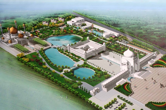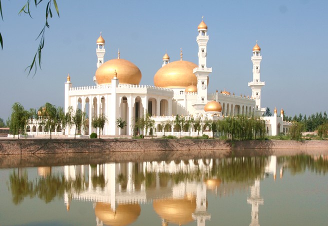 中華回鄉(xiāng)文化園主體大門是借鑒印度泰姬陵設計建造的。她高38米,長206米,即便是站在很遠的地方也能夠看得到她的身影。站在她的面前,她的高大、偉岸、恢宏,給你以視覺的沖擊。走近她,她潔白的身軀、飽滿的穹頂、絢麗的浮雕、繽紛的彩繪、精巧的結構,在藍天白云的映襯下,給你的是心靈的震撼。來到這里,你會被她濃郁的伊斯蘭風格所吸引、所感染、所陶醉;你會明白什么是圣潔的天堂;你還會深深的感受到,來到這里心靈即將經受一次伊斯蘭文化的洗禮。這是建園人的夢想,也是所要達到的目的,更是中華回鄉(xiāng)文化園所要突出的主題。