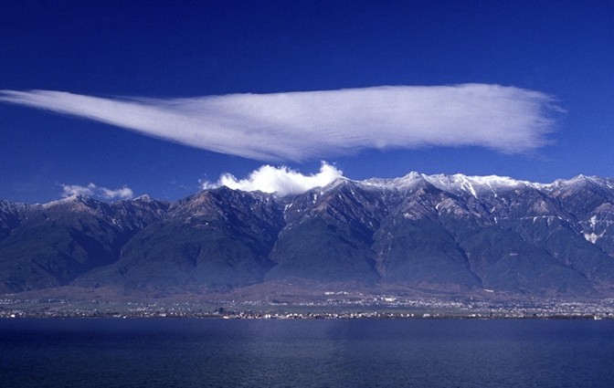 蒼山云景變幻萬千,其中最有名的是“望夫云”和“玉帶云”。望夫云每年冬春季節常出現于玉局峰頂,這云出現后洱海隨即狂風大作掀起陣陣驚濤駭浪,漁船不能出海,因此望夫云又被稱為“無渡云”。玉帶云不僅嫵媚動人,而且按白族農諺所說,她還是豐收的預兆:“蒼山系玉帶,餓狗吃白米”。