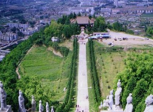 穿過祭祀?yún)^(qū),便進(jìn)入墓冢區(qū)。沿著長(zhǎng)長(zhǎng)的陵道拾級(jí)而上,兩邊塑立著百代帝王石像,總共16位,依歷史順序依次排列為:堯、舜、禹、啟、夏桀、成湯、盤庚、紂王、周文王、周武王、周幽王、周平王、鄭莊公、齊桓公、秦穆公、宋襄公等。