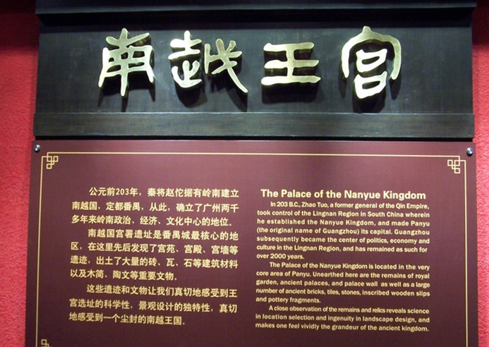 1995年、1997年在廣州北京路與中山四路交會處,發現了兩千年前趙佗建立的南越王宮署遺址。南越國宮署御苑中的大型石構水池和曲流石渠設計之獨特,構筑之精巧,規模之宏大,令人贊嘆不已。這處遺址先后兩次被評為全國十大考古發現。據悉這是中國迄今發現最早的御苑遺址,對研究古代建筑、古代園林和南北民族融合的歷史有重要的價值,是中國文化瑰寶,為廣州歷史名城精華所在。