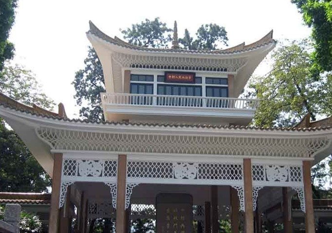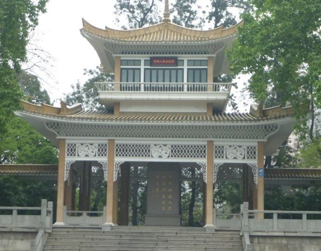 中朝人民血誼亭位于廣州起義烈士陵園內(nèi)東面,與中蘇人民血誼亭相對(duì)。建于1964年,坐南朝北。建筑平面呈“凹”字形,占地面積約3000平方米。黃色琉璃瓦,鋼筋混凝土結(jié)構(gòu)。主亭面闊三間12.85米,進(jìn)深三間13.06米,高二層,四角攢尖頂。上懸“中朝人民血誼亭”匾額。兩側(cè)各有總長(zhǎng)為33.7米的曲尺型長(zhǎng)廊,兩廊各連接面闊6米,進(jìn)深5.5米的卷棚歇山頂副亭,平面呈方形。中國(guó)傳統(tǒng)形式的建筑基座,帶有朝鮮民族風(fēng)格的屋脊和檐口裝飾為金達(dá)萊花和木棉花結(jié)合的圖案。亭前是水池,小橋橫跨其中。亭中心矗立著高大的花崗巖石紀(jì)念碑,碑座高0.96米、碑身高 4.3米、闊2.6米,上嵌紅棉圖案。紀(jì)念碑正面刻“中朝兩國(guó)人民的戰(zhàn)斗友誼萬(wàn)古長(zhǎng)青”, 版權(quán)所有山東聊城聊之旅國(guó)際旅行社有限公司,轉(zhuǎn)載必究!落款為“葉劍英”,題于“1964年十月一日”。背面鐫刻著著名書法家吳子復(fù)書寫的碑文,對(duì)在廣州起義中犧牲的朝鮮青年的事跡作了簡(jiǎn)明的介紹。