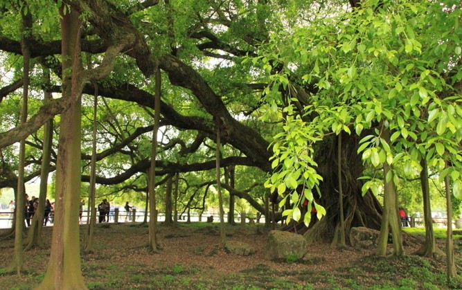 陽朔大榕樹矗立在金寶河畔,它的樹圍竟有七米多,高達十七米,枝繁葉茂,濃蔭蔽日,所蓋之地有一百多平方米。相傳已有千年歷史,雖然樹干老態龍鐘,盤根錯節,但仍然生機勃勃。在電影里,劉三姐就是在這棵樹下向阿牛哥吐露心聲,拋出傳情繡球的。版權所有山東聊城聊之旅國際旅行社有限公司,轉載必究!大榕樹公園位于陽朔城南7.5公里的高田鎮穿巖村的金寶河南岸。大榕樹樹高17米,圍7.05米,覆蓋面積100多平方米。樹冠呈圓形,遠望似一把綠傘,近看盤根錯節,葉茂蔽天。相傳此樹植于晉代,距今已有1500多年。進入了古榕公園以后,當您在冠如華蓋的巨大樹蔭下,慢慢端詳,細細品味。此時,您神清氣爽,身心俱靜,能夠感受到這神靈之樹如母親般對您的安撫和慰藉,深深沉浸在這綠色的愛意和溫馨之中,塵世間的憂愁與煩惱頓時消失殆盡。您看著眼前這棵虬根如虹,挺拔蒼勁,枝繁葉茂的千年古榕,如同看著一位鶴顏童發、面容安詳的百歲老人,心中充滿了敬意與感慨。您想到人世間的悲歡離合,生命中的風云際會,時間里的滄桑與感動,您可能還會想到很多很多。導游或者純樸的當地村民會告訴您,相傳古榕樹為唐代所種植,至今已有一千四百多年的歷史。古榕樹高達十七米,樹圍七米多,可以投下一千二百六十平方米的陰涼。版權所有山東聊城聊之旅國際旅行社有限公司,轉載必究!您想,這是怎樣一種精神境界,又有著多么頑強的生命力啊。還有那十余米長,一米多粗的貼地橫出的樹干,如巨人伸出一只力舉萬鈞的手臂,又似一條蓄勢待發,急欲騰飛的巨龍。那藤蔓交錯的虬枝,那在微風中如珠簾般飄拂的須根,無不使您心旌神搖,產生無窮遐想。