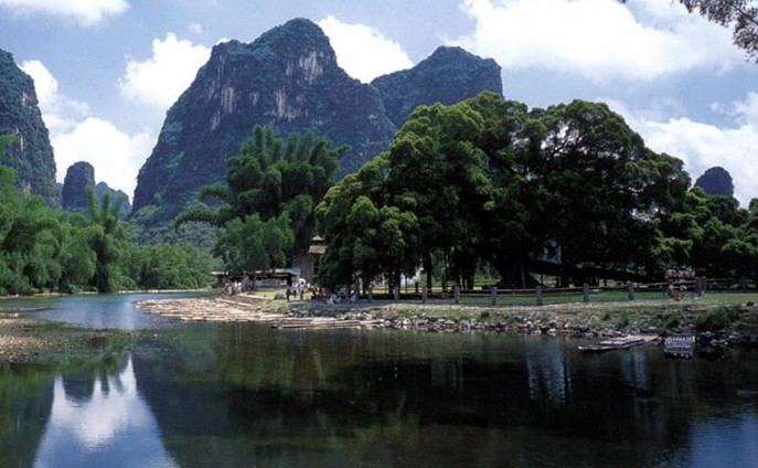大榕樹位于陽朔縣城南7.5公里。樹高17米,樹圍7.05米,遠望似一綠色巨傘撐立地上。隔河有穿巖,組成穿巖古榕景點。陽朔大榕樹景區是世界巖溶喀斯特地貌峰林峰叢最集中、最典型、最有代表性的地方,以奇特的巖溶喀斯特地貌、如詩如畫般的山水田園風光和豐富的壯族少數民族民俗文化聞名天下。詩情畫意韻律優美的稻田,清澈見底的小河,青翠濕潤的山峰,鳳尾竹,壯家村寨,水車,清新爽人的空氣,標示著這里人與自然的完美和諧,更似一幅藝術水平極高的中國水墨山水畫長卷。曾被美國哈佛大學博士、世界著名園林專家卡爾稱為:在中國看到了最美麗的地方。風靡中國及東南亞地區的電影《劉三姐》很多鏡頭在此拍攝,影片中劉三姐與阿牛哥大榕樹下拋繡球定終身的情景打動了天下有情人。