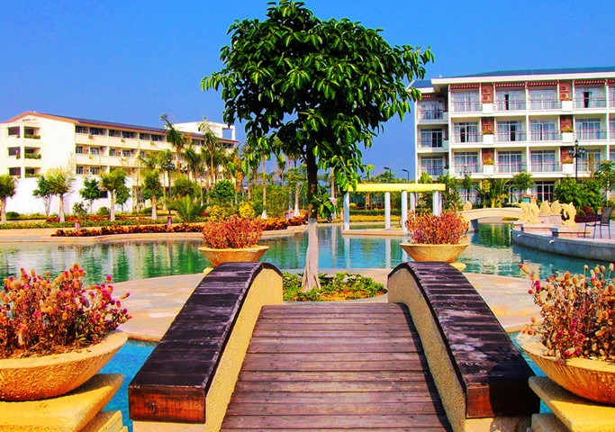 度假區(qū)總占地面積為1000畝。其中首期工程占地面積為500畝,其中設(shè)有別墅區(qū)、溫泉區(qū)、餐飲區(qū)、娛樂區(qū)、健身區(qū)、休閑區(qū)等項(xiàng)目。區(qū)內(nèi)有十分豐富的溫礦泉水資源,溫泉出口處水溫高達(dá)82攝氏度,富含大量鈣、鎂、氡等幾十種對(duì)人體有益的微量元素,對(duì)風(fēng)濕病、腰肌勞損、腸胃病、神經(jīng)性骨痛等多種潛在疾病有顯著療效。目前該度假區(qū)已完成首期工程,并已于2005年9月26日正式對(duì)外接待游客。度假區(qū)內(nèi)綠樹成蔭,小河流水,小島別墅區(qū)的形狀猶如一把西施扇,把整個(gè)度假區(qū)置身于群山的懷抱中。區(qū)內(nèi)設(shè)施配套齊全,目前設(shè)有575間客房、31棟別墅、三個(gè)中餐廳(同時(shí)可容納1650人)、兩個(gè)西餐廳、歌舞廳、溫泉大浴池、桑拿,以及為顧客提供咖啡廳、茶藝?yán)取⒊小⒕肺荨⒋筇冒伞⒂斡境亍⒆狼蚴摇⑵古仪蚴摇⒂鹈蚴摇⒋笮偷母郀柗蚓毲驁觥⒕W(wǎng)球場、健身房、沐足等各種服務(wù)設(shè)施一應(yīng)俱全。