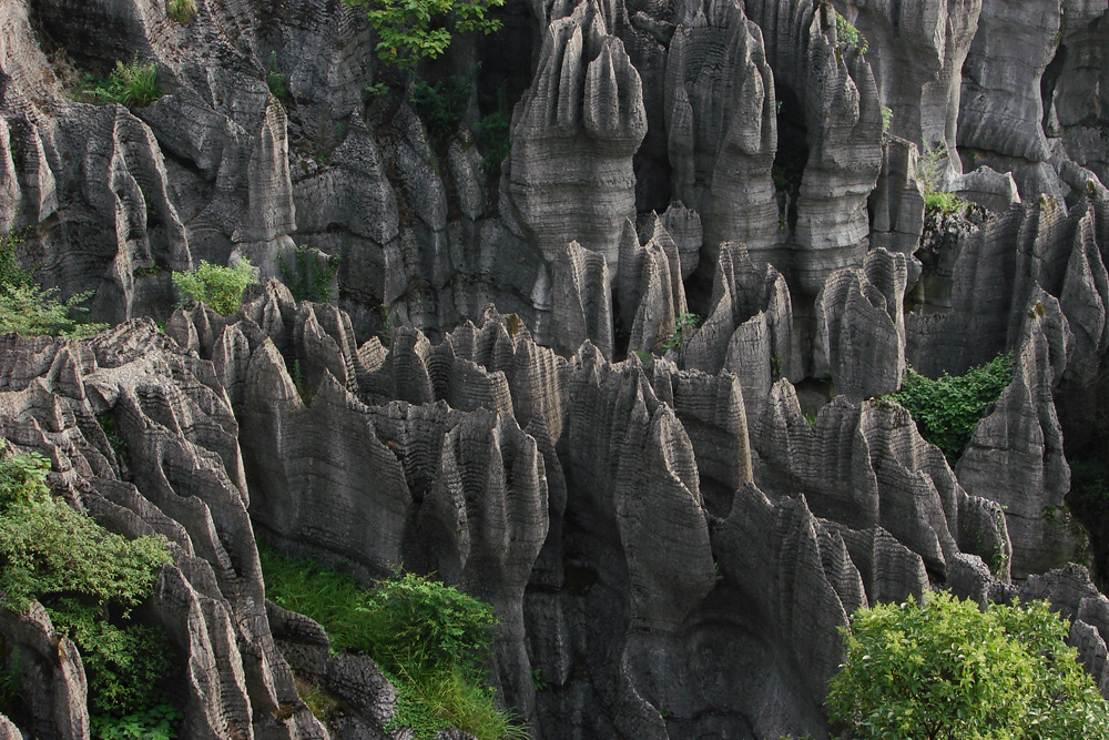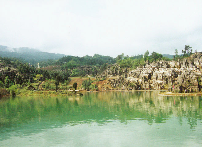 該類景觀典型的喀斯特地貌,表面呈虎皮狀。在這里,群峰壁立,奇峰危石,可謂千姿百態,石門、石寨、石柱等,酷似人工堆疊,卻無人工痕跡;飛禽走獸的石頭,栩栩如生、惟妙惟肖;田園阡陌、炊煙裊裊,清泉碧池,清麗若未施粉黛的閨秀楚楚動人。顯示出萬盛石林景觀的美感與靈性。