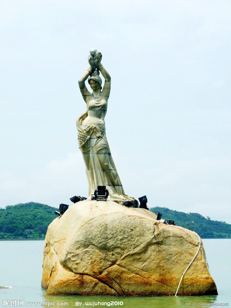 珠海市風(fēng)景秀麗的香爐灣畔,矗立著一尊巨型石雕——珠海漁女,一條美麗整潔的環(huán)海大道——情侶路從她身旁穿過,更使她顯得純潔而大方。她領(lǐng)戴項珠,身掮魚網(wǎng),褲腳輕挽,帶著喜悅而又含羞的神情雙手高高擎舉著一顆晶瑩璀璨的珍珠,獻給德高望重的九洲長老,并向世界昭示著光明,向人類奉獻珍寶。