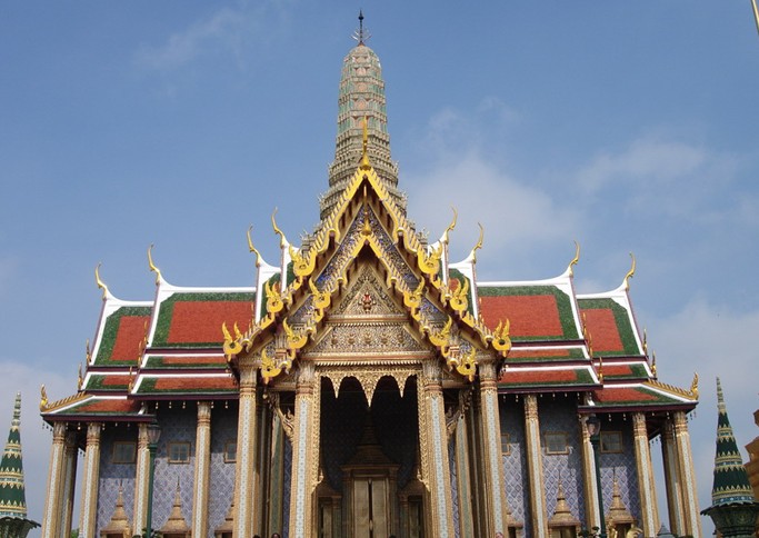 大皇宮(The Grand Palace)緊鄰湄南河,是曼谷中心內一處大規模古建筑群(計28座),總面積二十一萬八千四百平方米。大皇宮是仿照故都大城的舊皇宮建造的,經歷代君王不斷擴建,終于建成現在這座規模宏大的大皇宮建筑群。大皇宮是泰國諸多王宮之一,是歷代王宮保存最完美、規模最大、最有民族特色的王宮。曼谷王朝從拉瑪一世到拉瑪八世,均居于大皇宮內。1946年拉瑪八世在宮中被刺之后,拉瑪九世便搬至大皇宮東面新建的集拉達宮居住。現在,大皇宮除了用于舉行加冕典禮、宮廷慶祝等儀式和活動外,平時對外開放,成為泰國著名的游覽場所。