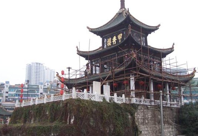 待度山山頂矗立著“甲秀樓”古塔。據說甲秀樓建于清嘉慶十年(1850年)。為兩層泥塔,高15米,呈六角形,似葫蘆蓋頂,塔尖直指藍天,造形獨持,十分壯觀。