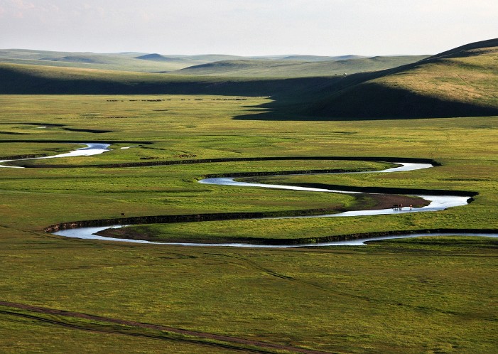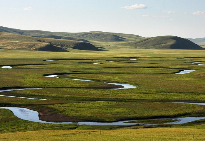 要說莫爾格勒河最美的地方當數(shù)中下游的草原地區(qū)。藍天,白云,青山,碧水,百花爛漫,綠草如茵,莫爾格勒河在無垠的草原上九曲回腸地轉了無數(shù)道彎,撫挽滋潤著風光秀美的牧場,猶如一幅美麗的風景畫;而河邊飄著炊煙的蒙古包,游動著的牛馬羊群,又給畫面增添了無限生機。