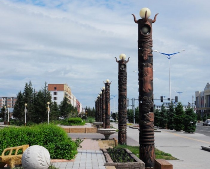 鄂溫克博物館正門前身著盔甲、手持武器騎在駿馬上的鄂溫克民族英雄海蘭察的銅像。揚(yáng)蹄的駿馬、堅(jiān)毅的表情顯示出了海蘭察將軍安內(nèi)如鷹、攘外似虎的赤膽忠心和高超的武藝及鄂溫克人的驍勇善戰(zhàn),保家愛國的精神。