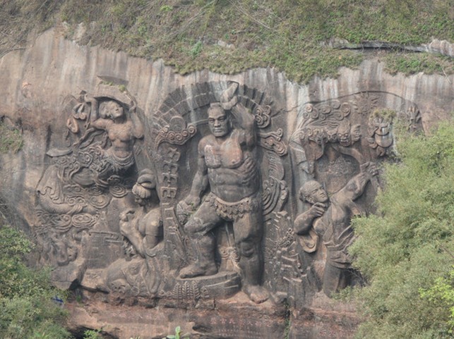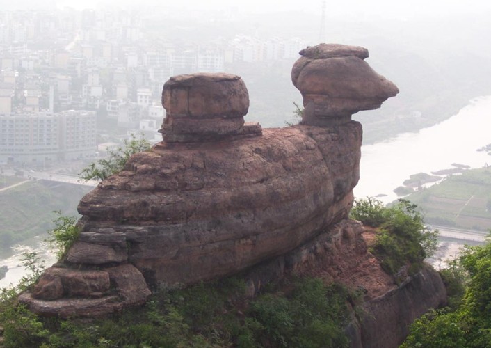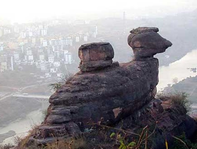 在摩崖峭壁上,以《盤古開天地》、《女媧補天》、《后羿射日除獸》組成我國神話傳說的《華夏魂》,高14米、寬20米的大型摩崖石雕。百步天梯之下,是地勢隱蔽的狹谷,傳說金雞的配偶就選擇這塊地方下蛋,故稱蛋谷。母雞把孵出的小雞,一群群地帶往外地安家落戶,繁衍子孫。樂昌古佛巖的“鷹撲雞群”一景,有人說就是它他的后代。登上螺旋梯的頂端,就是“朝陽亭”了,何謂朝陽亭?就是不論是旭日東升,還是夕陽西下,陽光總是照射到這個亭子。
